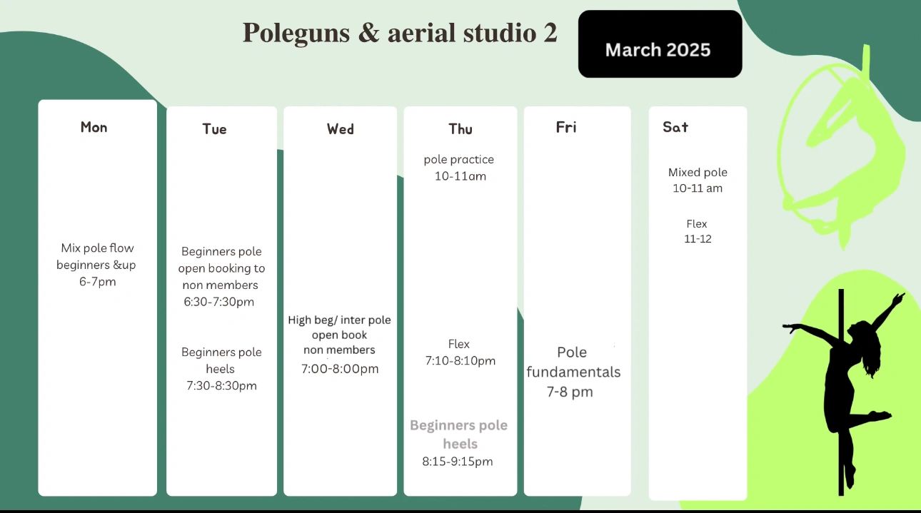 Classes running at the second studio 2, are still on the same site, just a 2 min walk past unit 44, this timetable has the added addition of pole classes open to non members. we will not be open to non members for ever so dont miss out.